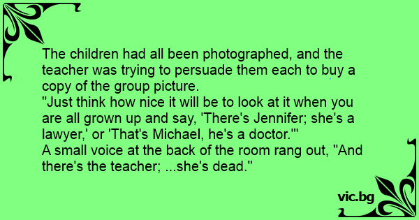 Діти з вчителькою знялися на фотку. Вчителька переконує їх купити кожному собі по фотографії: — Представте, як це здорово — коли ви вже будете дорослими, подивитесь на фото і скажете: "А ось Марічка, вона тепер актриса. А це ось Петрик, він тепер лікар... " Тут пролунав тихий голос Вовочки із...