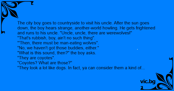 The city boy goes to countryside to visit his uncle. After the sun goes down, the boy hears strange, another-world howling. He gets frightened and runs to his uncle. "Uncle, uncle, there are werewolves!"