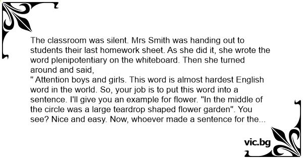 " Attention boys and girls. This word is almost hardest English word in the world. So, your job is to put this word into a sentence. I'll give you an example for flower. "In the middle of the circle was a large teardrop shaped flower garden". You see? Nice and easy. Now, whoever made a sentence for the word plenipotentiary, there will be no homework for a month for him or her. So, start now. PLENIPOTENTIARY." Nobody seemed to do it but a boy called Darrell ( Stupidest kid in the classroom) far in the back raised his hand. Everybody stared at him and opened their mouth. Even Mrs Smith. " Oh Darrell, don't tell me you got it. I mean it is impossible for you to get the right answer for easy questions in the first place." Mrs Smith embarrassed him. Nearly everyone laughed. " No Miss, I actually got it. So here it goes, " In the classroom, the teacher shouted out the word plenipotentiary."