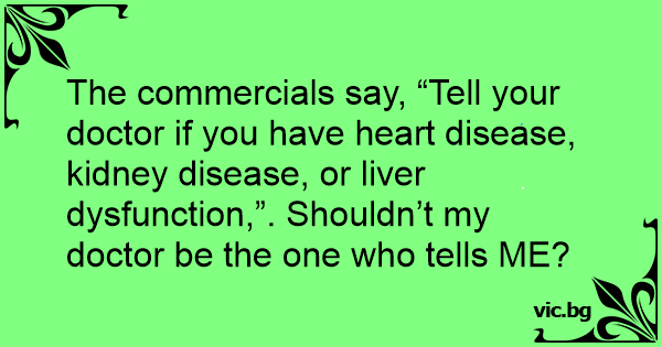 The commercials say, “Tell your doctor if you have heart disease, kidney disease, or liver dysfunction,”. Shouldn’t my doctor be the one who tells ME?