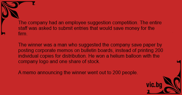 The winner was a man who suggested the company save paper by posting corporate memos on bulletin boards, instead of printing 200 individual copies for distribution. He won a helium balloon with the company logo and one share of stock.