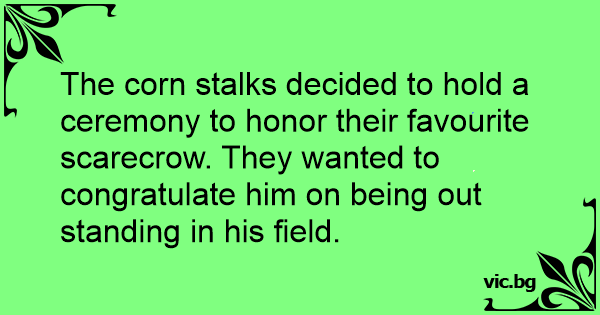 The corn stalks decided to hold a ceremony to honor their favourite scarecrow. They wanted to congratulate him on being out standing in his field.