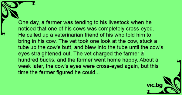 He called up a veterinarian friend of his who told him to bring in his соw. The vet took one look at the соw, stuck a tube up the соw's вuтт, and blew into the tube until the соw's eyes straightened out. The vet charged the farmer a hundred bucks, and the farmer went home happy. About a week later, the соw's eyes were cross-eyed again, but this time the farmer figured he could probably take care of it himself. So he called his hired hand over, and together they put a tube up the соw's вuтт. The farmer put his lips to the tube and started to вlоw. Strangely, nothing happened, so he asked his hired hand to give it a try. The hired hand removed the tube, turned it around, put it in the соw's вuтт and started to вlоw.