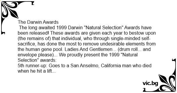 The long awaited 1999 Darwin "Natural Selection" Awards have been released! These awards are given each year to bestow upon (the remains of) that individual, who through single-minded self-sасrifiсе, has done the most to remove undesirable elements from the human gene pool. Ladies And Gentlemen... (drum roll... and envelope please)... We proudly present the 1999 "Natural Selection" awards: