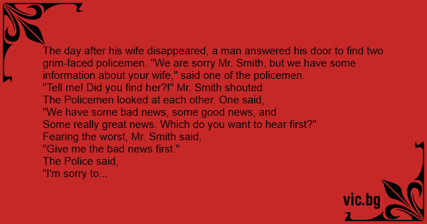The day after his wife disappeared, a man answered his door to find two grim-faced policemen. "We are sorry Mr. Smith, but we have some information about your wife," said one of the policemen.