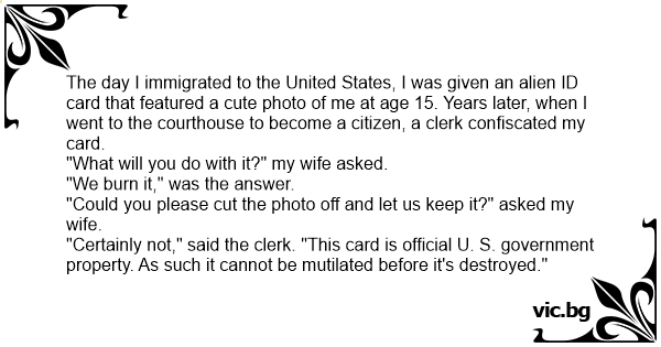 The day I immigrated to the United States, I was given an alien ID card that featured a cute photo of me at age 15. Years later, when I went to the courthouse to become a citizen, a clerk confiscated my card.