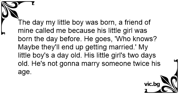 The day my little boy was born, a friend of mine called me because his little girl was born the day before. He goes, 'Who knows? Maybe they'll end up getting married.' My little boy's a day old. His little girl's two days old. He's not gonna marry someone twice his age.