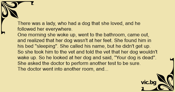 One morning she woke up, went to the bathroom, came out, and realized that her dog wasn't at her feet. She found him in his bed ''sleeping''. She called his name, but he didn't get up. So she took him to the vet and told the vet that her dog wouldn't wake up. So he looked at her dog and said, ''Your dog is dead''. She asked the doctor to perform another test to be sure.