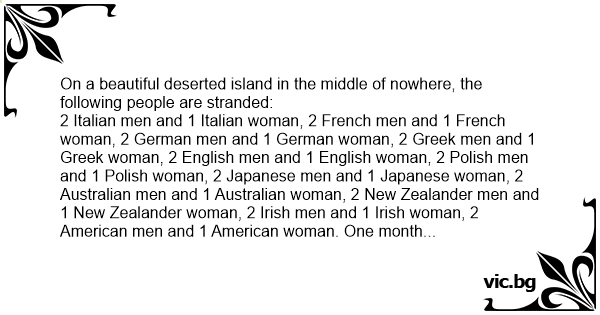 On a beautiful deserted island in the middle of nowhere, the following people are stranded: 2 Italian men and 1 Italian woman, 2 French men and 1 French woman, 2 German men and 1 German woman, 2 Greek men and 1 Greek woman, 2 English men and 1 English woman, 2 Polish men and 1 Polish woman, 2 Japanese men and 1 Japanese woman, 2 Australian men and 1 Australian woman, 2 New Zealander men and 1 New Zealander woman, 2 Irish men and 1 Irish woman, 2 American men and 1 American woman. One month later, the following things have occurred.... One Italian man killed the other Italian man for the Italian woman. The two French men and the French woman are living happily together, having loads of sеx. The two German men have a strict weekly schedule of when they alternate with the German woman. The two Greek men are sleeping with each other and the Greek woman is cleaning and cooking for them. The two English men are waiting for someone to introduce them to the English woman. The Polish men took a long look at the endless ocean and one look at the Polish woman and they started swimming. The two Japanese men have faxed Tokyo and are waiting for instructions. The two Australian men beat each other senseless fighting over the Australian woman, who called them both bloody wankers and is checking out all the other men. Both New Zealand men are searching the island for sheep. The Irish began by dividing the island into North and South and setting up a distillery. They do not remember if sеx is in the picture because it gets sort of foggy after the first few liters of coconut whiskey, but they are satisfied in that at least the English are not getting any. The American woman keeps on вiтсhing about her body being her own, the true nature of feminism, how she can do everything that they can do, about the necessity of fulfillment, the equal division of household chores, how her last boyfriend respected her opinions and treated her much nicer and how her relationship with her mother is mproving. The two American men have committed suicide.