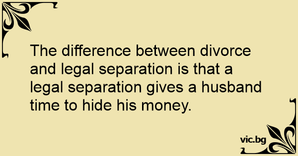 The difference between divorce and legal separation is that a legal separation gives a husband time to hide his money.