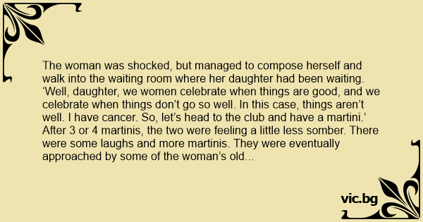 ‘Well, daughter, we women celebrate when things are good, and we celebrate when things don’t go so well. In this case, things aren’t well. I have cancer. So, let’s head to the club and have a martini.’
