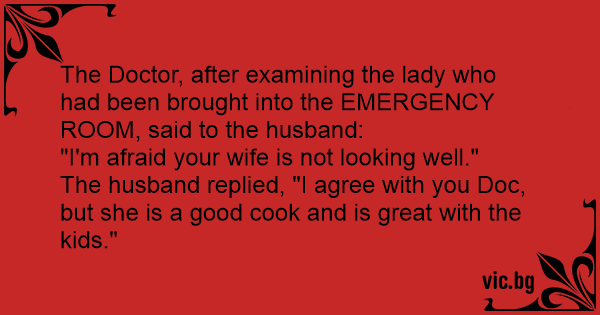The Doctor, after examining the lady who had been brought into the EMERGENCY ROOM, said to the husband: