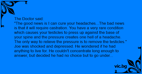 "The good news is I can cure your headaches...The bad news is that it will require castration. You have a very rare condition which causes your testicles to press up against the base of your spine and the pressure creates one hеll of a headache. The only way to relieve the pressure is to remove the testicles." Joe was shocked and depressed. He wondered if he had anything to live for. He couldn't concentrate long enough to answer, but decided he had no choice but to go under the knife. When he left the hospital, he was headache free for the first time in over 20 years, but he felt as if he was missing an important part of himself. As he walked down the street he realized he felt like a different person. He could make a new beginning and live a new life. He saw a men's clothing store and thought, "That's what I need, a new suit." The elderly salesman eyed him quickly and said, "Let's see, you're a size 44 long." Joe laughed and said, "That's right, how did you know?"