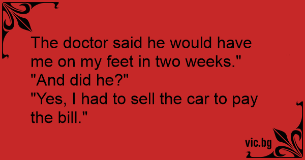 Un uomo si confida con un amico: "Sai sono stato dal quel famoso specialista, ed egli mi ha assicurato che mi avrebbe fatto camminare in 2 settimane!" "Cavolo, e c’è riuscito?" "Sì per forza, ho dovuto vendere la macchina per pagare il conto!"
