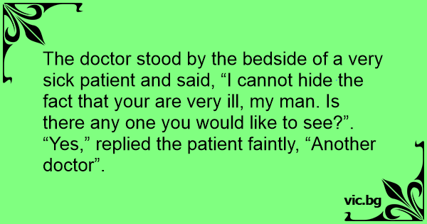 The doctor stood by the bedside of a very sick patient and said, “I cannot hide the fact that your are very ill, my man. Is there any one you would like to see?”.