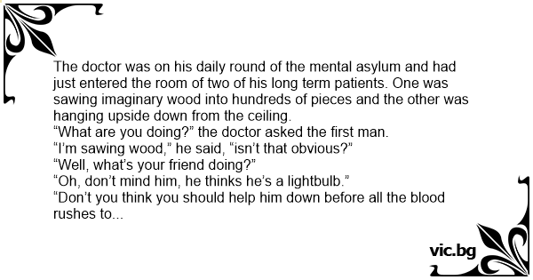 The doctor was on his daily round of the mental asylum and had just entered the room of two of his long term patients. One was sawing imaginary wood into hundreds of pieces and the other was hanging upside down from the ceiling.