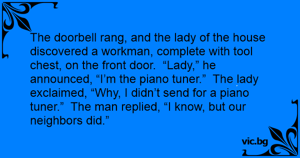 The doorbell rang, and the lady of the house discovered a workman, complete with тооl chest, on the front door. “Lady,” he announced, “I’m the piano tuner.” The lady exclaimed, “Why, I didn’t send for a piano tuner.” The man replied, “I know, but our neighbors did.”