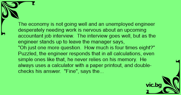"Oh just one more question. How much is four times eight?" Puzzled, the engineer responds that in all calculations, even simple ones like that, he never relies on his memory. He always uses a calculator with a paper printout, and double-checks his answer. "Fine", says the manager, but I just want you to tell me the answer anyway from memory without using your calculator. "Sure," says the engineer. "Four times eight is, uh, thirty-four." After saying goodbye and leaving the building, the engineer hurriedly pushes up four times eight into his calculator and curses when he sees the answer.