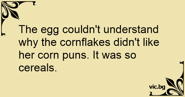 The egg couldn't understand why the cornflakes didn't like her corn puns. It was so cereals.