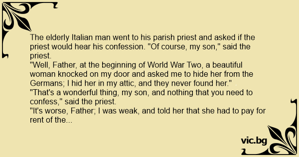 Ein älterer Italiener bat seinen Priester, ihm die Beichte abzunehmen. "Vater, während des 2. Weltkrieges klopfte eine Frau an meine Tür und bat mich, sie auf meinem Dachboden vor den Deutschen zu verstecken." Der Priester sagte: "Das war wundervoll von Dir und Du brauchst dafür nicht zu...