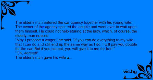 “May I propose a wager,” he said. “If you can do everything to my wife that I can do and still end up the same way as I do, I will pay you double for the car. But if you cannot, you will give it to me for free!”