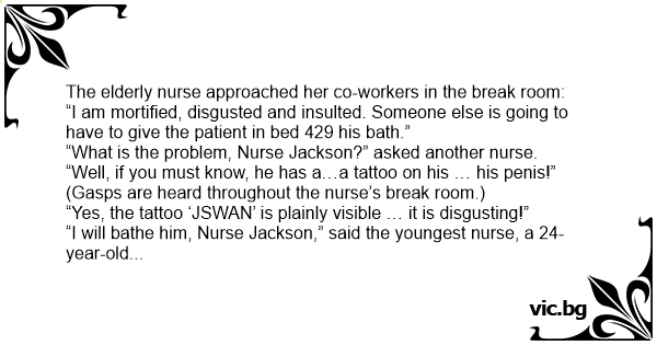 Hours later, the nurses are having their lunch in the break room, and Sheryl, the young nurse, smiles and says, “Nurse Jackson was wrong about the tattoo. It doesn’t say ‘JSWAN’, it says ‘JOE’S BAR AND GRILLE SASKATCHEWAN!’ “