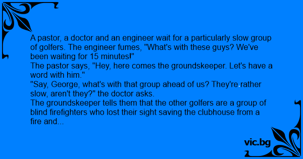 A pastor, a doctor and an engineer wait for a particularly slow group of golfers. The engineer fumes, "What's with these guys? We've been waiting for 15 minutes!"