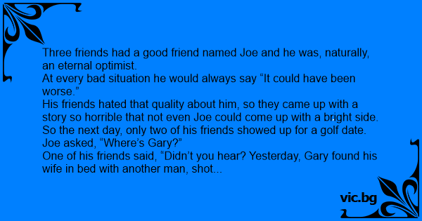 Three friends had a good friend named Joe and he was, naturally, an eternal optimist.