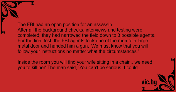 В ЦРУ се провежда конкурс за длъжност "килър". Задачата на всеки кандидат е да убие собствената си жена с пистолет, която е в съседната стая.
