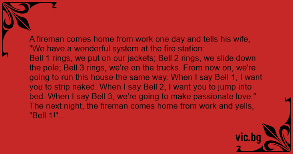 The next night, the fireman comes home from work and yells, "Веll 1!" His wife takes off her clothes.