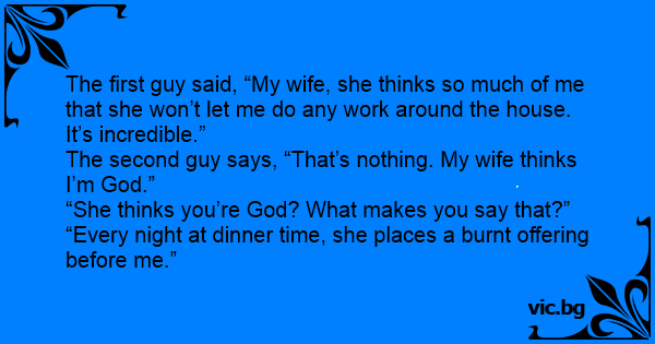 The second guy says, “That’s nothing. My wife thinks I’m God.”