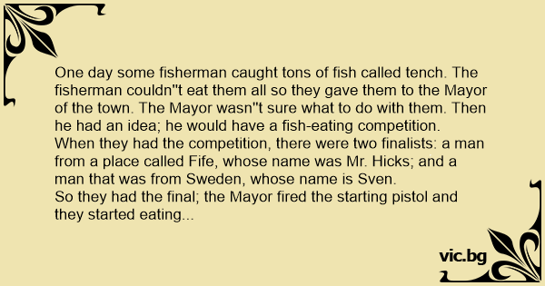 One day some fisherman caught tons of fish called tench. The fisherman couldn''t eat them all so they gave them to the Mayor of the town. The Mayor wasn''t sure what to do with them. Then he had an idea; he would have a fish-eating competition.