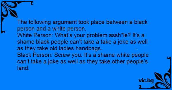 Black Person: Sсrеw you. It’s a shame white people can’t take a joke as well as they take other people’s land.