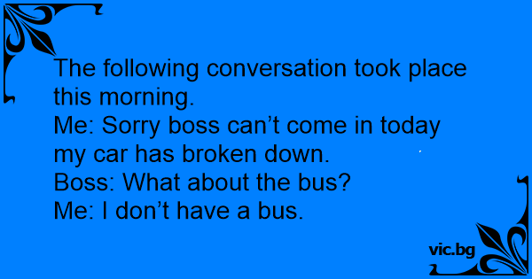 Me: Sorry boss can’t come in today my car has broken down.