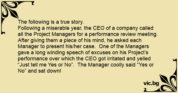 Following a miserable year, the CEO of a company called all the Project Managers for a performance review meeting. After giving them a piece of his mind, he asked each Manager to present his/her case. One of the Managers gave a long winding speech of excuses on his Project’s performance over which the CEO got irritated and yelled “Just tell me Yes or No”. The Manager coolly said “Yes or No” and sat down!