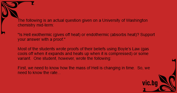 Ist die Hölle exotherm oder endotherm? Manchmal ist auch Physik lustig..... Nachfolgend lesen Sie eine Prüfungsfrage aus der aktuellen Zwischenprüfung im Fach Chemie an der Universität von Washington. Die Antwort eines Teilnehmers war "so profund", dass der Professor Sie via Internet mit...