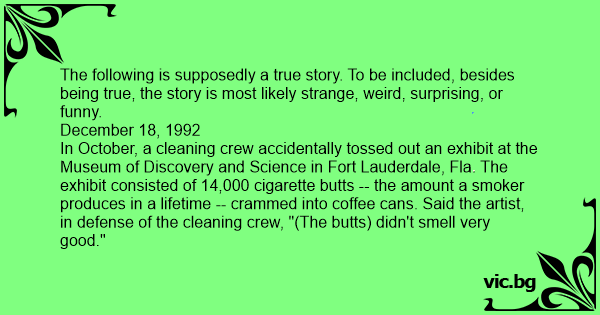 In October, a cleaning crew accidentally tossed out an exhibit at the Museum of Discovery and Science in Fort Lauderdale, Fla. The exhibit consisted of 14,000 cigarette butts -- the amount a smoker produces in a lifetime -- crammed into coffee cans. Said the artist, in defense of the cleaning crew, "(The butts) didn't smell very good."