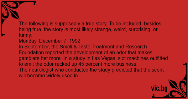 In September, the Smell & Taste Treatment and Research Foundation reported the development of an odor that makes gamblers bet more. In a study in Las Vegas, slot machines outfitted to emit the odor racked up 45 percent more business.