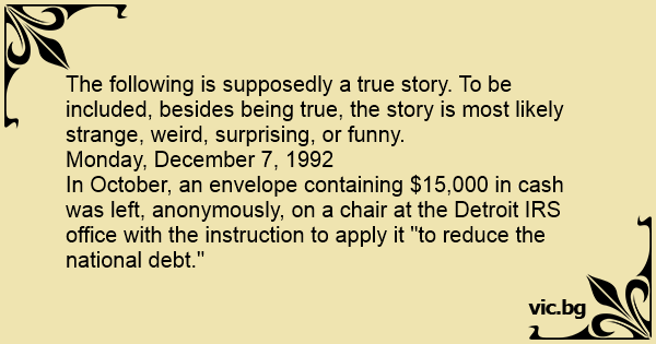 In October, an envelope containing $15,000 in cash was left, anonymously, on a chair at the Detroit IRS office with the instruction to apply it "to reduce the national debt."