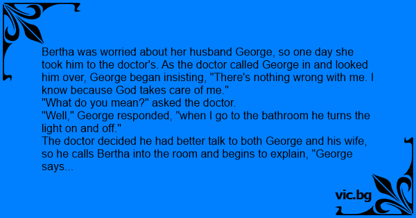Bertha was worried about her husband George, so one day she took him to the doctor's. As the doctor called George in and looked him over, George began insisting, "There's nothing wrong with me. I know because God takes care of me."
