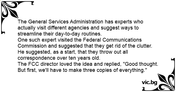 One such expert visited the Federal Communications Commission and suggested that they get rid of the clutter. He suggested, as a start, that they throw out all correspondence over ten years old.