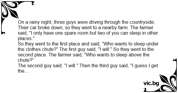 On a rainy night, three guys were driving through the countryside. Their car broke down, so they went to a nearby farm. The farmer said, "I only have one spare room but two of you can sleep in other places."