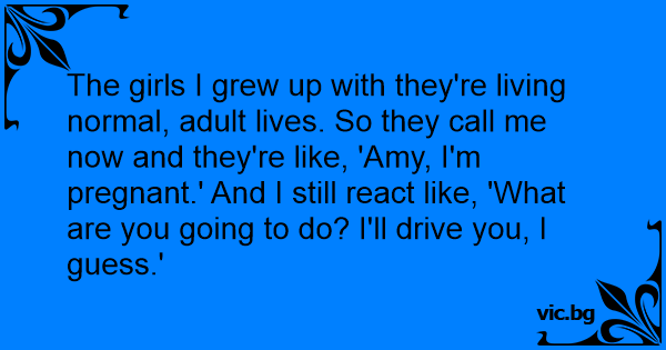 The girls I grew up with they're living normal, adult lives. So they call me now and they're like, 'Amy, I'm pregnant.' And I still react like, 'What are you going to do? I'll drive you, I guess.'