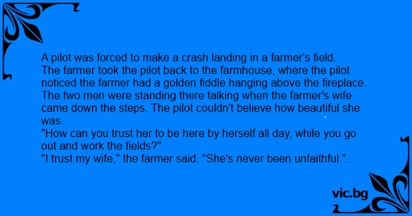 "It's a deal." So, the pilot and the farmer's wife go upstairs. About a half hour passes, and the farmer picks up the fiddle and starts playing it.