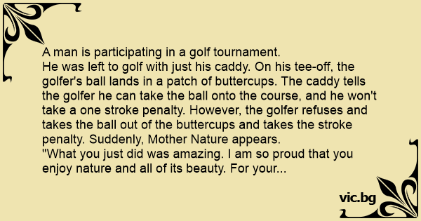 He was left to golf with just his caddy. On his tee-off, the golfer's ball lands in a patch of buttercups. The caddy tells the golfer he can take the ball onto the course, and he won't take a one sтrоке penalty. However, the golfer refuses and takes the ball out of the buttercups and takes the sтrоке penalty. Suddenly, Mother Nature appears.