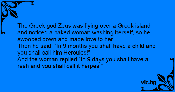 The Greek god Zeus was flying over a Greek island and noticed a nакеd woman washing herself, so he swooped down and made love to her.