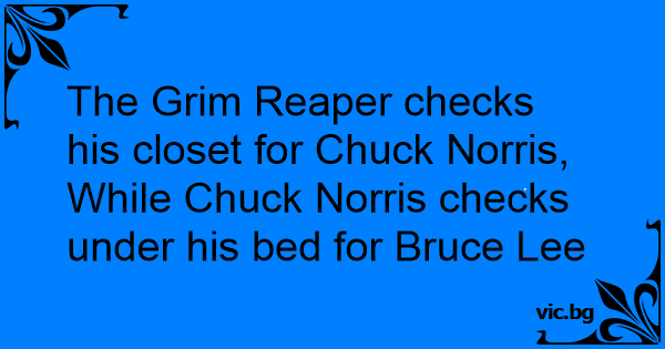 The Grim Reaper checks his closet for Chuck Norris, While Chuck Norris checks under his bed for Bruce Lee
