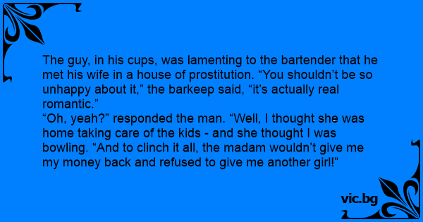 The guy, in his cups, was lamenting to the bartender that he met his wife in a house of prostitution. “You shouldn’t be so unhappy about it,” the barkeep said, “it’s actually real romantic.”