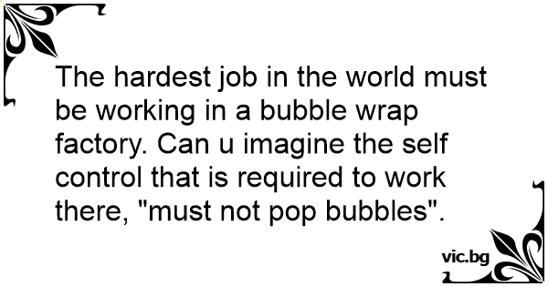The hardest job in the world must be working in a bubble wrap factory. Can u imagine the self control that is required to work there, "must not pop bubbles".