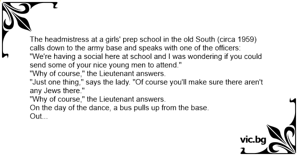The headmistress at a girls' prep school in the old South (circa 1959) calls down to the army base and speaks with one of the officers: